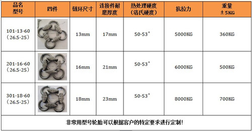保養(yǎng)鏈耐磨性好,抗疲勞性強(qiáng),根據(jù)使用條件壽命達(dá)3000-8000小時(shí)。拆裝方便,省時(shí)省力,產(chǎn)品規(guī)格齊全,可與進(jìn)口裝載機(jī)所匹配,輪胎保護(hù)鏈,采用高科技耐磨材料制成其結(jié)構(gòu)新穎緊湊,性能穩(wěn)定,主要適用于礦山作業(yè)的裝載機(jī),其輪胎磨損快,使用壽命短,輪胎價(jià)格昂貴,使用成本高,將本產(chǎn)品嚴(yán)密的包裹在裝載機(jī)的輪胎上,可以有效的保護(hù)裝載機(jī)的輪胎,不被尖銳的石塊劃傷刺破,延長了輪胎的使用壽命,使用一條輪胎保護(hù)鏈,能節(jié)省十條輪胎以上的費(fèi)用還能提高裝載機(jī)的工作效率和安全是礦山作業(yè)的必備品。